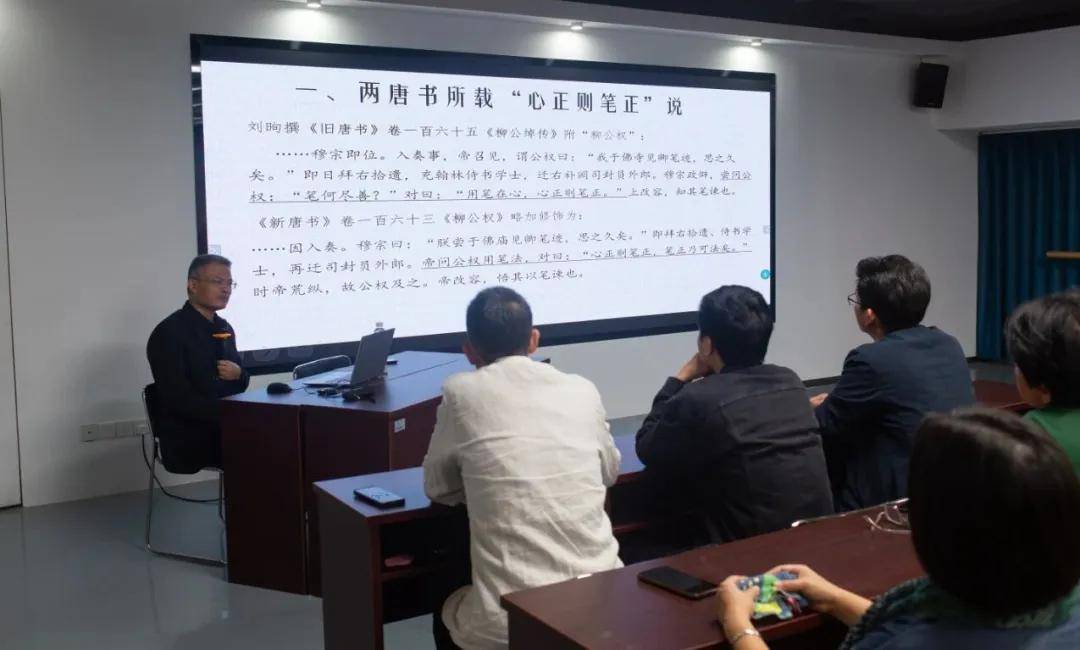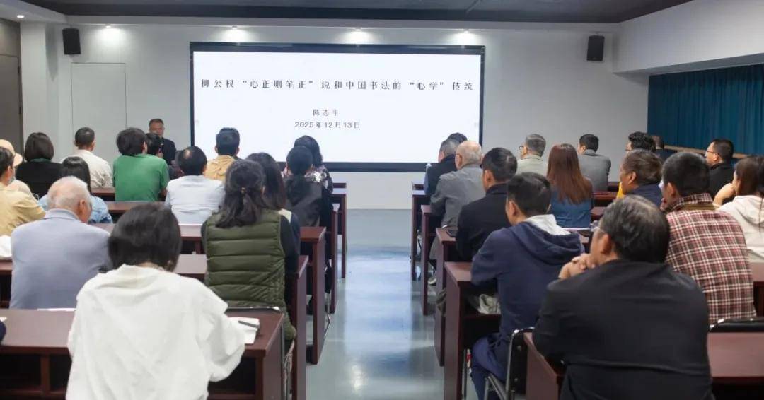 讲座上,陈志平并未局限于具体笔法技法的讲授,而是引领听众进行了一场深度的书法文化哲思之旅。他以《柳公权“心正则笔正”说和中国书法的“心学”传统》为题,层层剖析,指出当代人对书法的理解与汉、魏晋、唐等历史时期人们的认知存在差异,当前书法教育与实践存在一定程度的“异化”,过分强调视觉形式与技法训练,而忽视了其更深层的文化核心与修身功能。