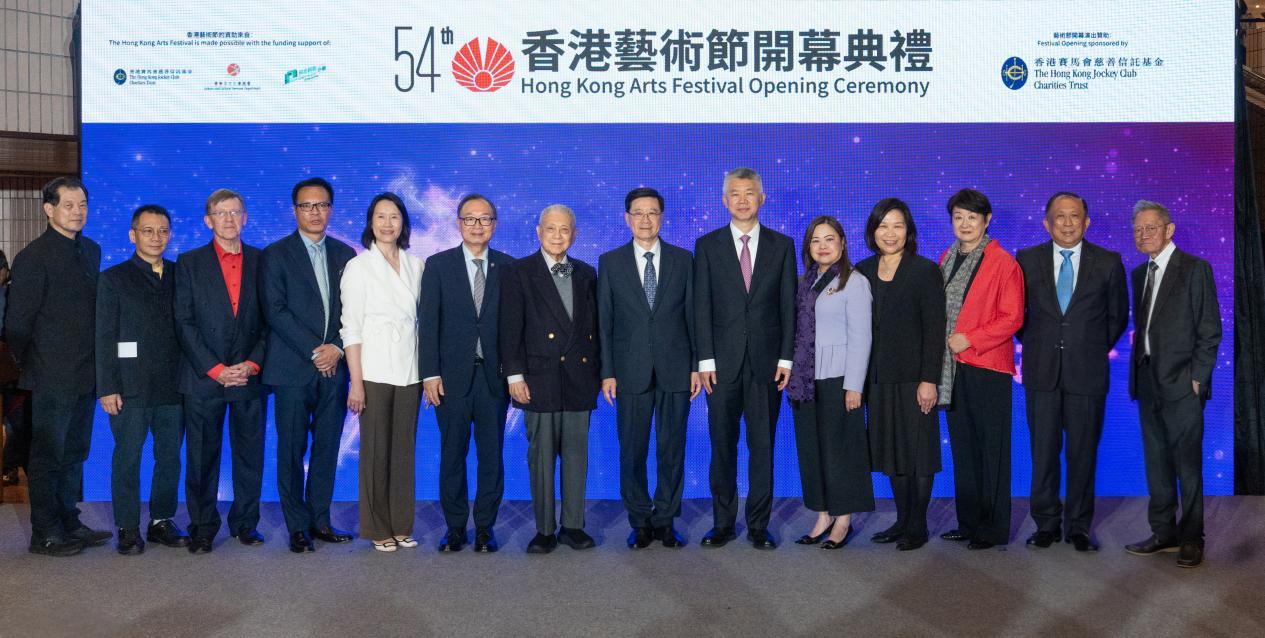 第54届香港艺术节于2月27日晚上隆重开幕。开幕仪式主礼嘉宾包括(从左至右):康乐及文化事务署署长陈咏雯女士、香港赛马会主席廖长江先生、香港艺术节主席卢景文教授、香港特别行政区行政长官李家超先生、中央人民政府驻香港特别行政区联络办公室副主任孙尚武先生、文化体育及旅游局局长罗淑佩女士,以及香港艺术节行政总监余洁仪女士